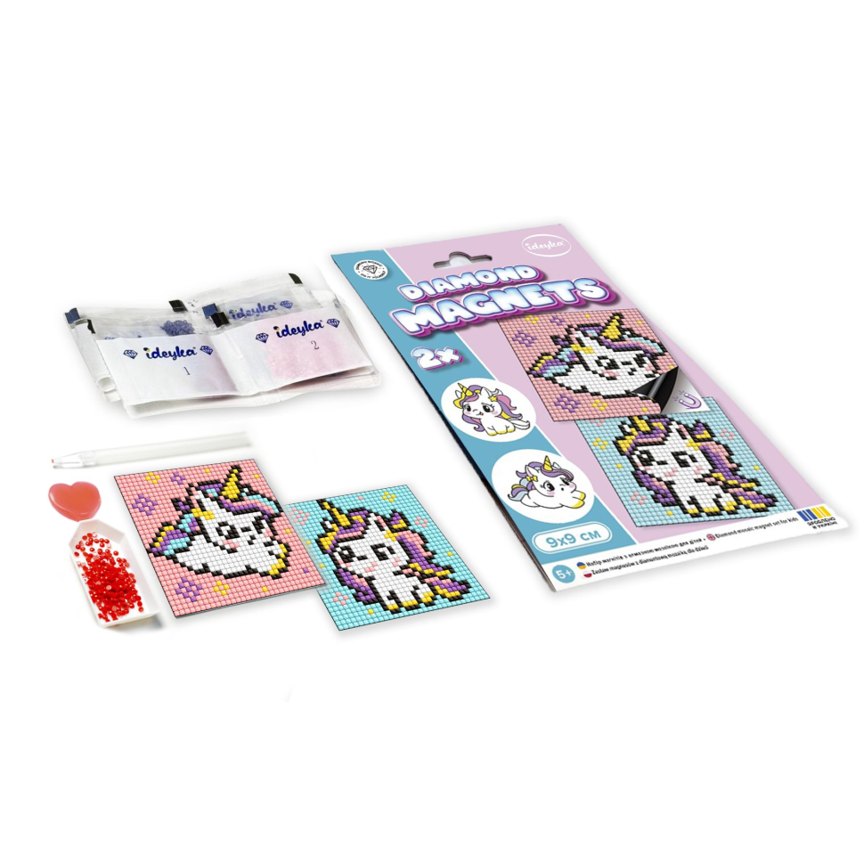 Ideyka представляет новый формат творчества – алмазную мозаику на магните. Этот набор позволяет легко создавать яркие магниты, которые станут оригинальным украшением холодильника или другой металлической поверхности. Благодаря карманному размеру набор идеально подходит для путешествий – его можно взять в дорогу, на отдых или даже в кафе, чтобы занять детей полезным и интересным делом. Процесс выкладки алмазной мозаики прост и увлекателен, а результат – уникальный аксессуар, сделанный собственноручно. Это отличная идея для подарка или стильный элемент декора, который будет радовать глаз каждый день. Состав набора: - магнитное основание с клеевым слоем и цветной схемой - 2 шт, без подрамника, - акриловые стразы согласно комплектации набора (круглые), - специальная ручка-стилус для работы со стразами, - гель-клей, - лоток для сортировки стразов, - таблица соответствия цветов и символов (смотрите на обороте этикетки). Алмазная мозаика на магните - Два однорожка, набор из 2 сюжетов для вашего творчества в интернет-магазине Ideyka. Изготовлен в Украине. Цвета готовой мозаики могут незначительно отличаться от показанных на картинке! Размер картины: 9х9 Сложность картины: 1 Звезда (Легкая) Количество цветов: 6