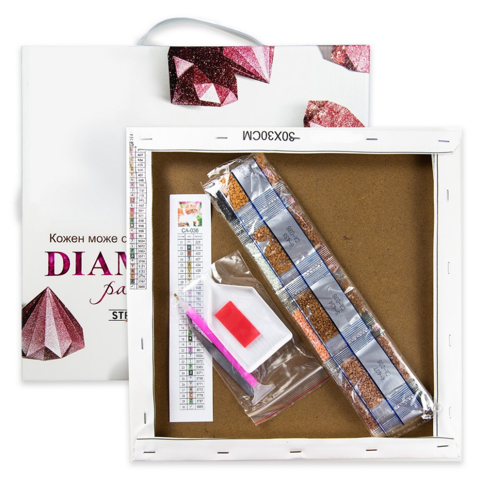 Алмазная мозаика – это новый вид аппликации. Специальные бусинки нужно приклеивать стилусом на холст. Так вы сможете создать блестящий шедевр – картину, выложенную сверкающими камнями. В наборе есть все необходимые инструменты: хлопковое полотно на деревянном подрамнике с клеевым слоем, уплотненное слоем ДВП; квадратные камни-стразы; специальный стилус; липкая масса для стилуса; пинцет; лоток для удобной сортировки камней; схема соответствия цвета камней и символов на холсте. Если вы ищете оригинальный подарок – набор алмазной вышивки от украинского производителя Strateg именно то, что нужно! Сложность картины: 3 Звезды (Средний) Размер: 30х30 см Обратите внимание — цвет может отличаться от того, что на фото, поскольку фото обрабатывается перед публикацией.