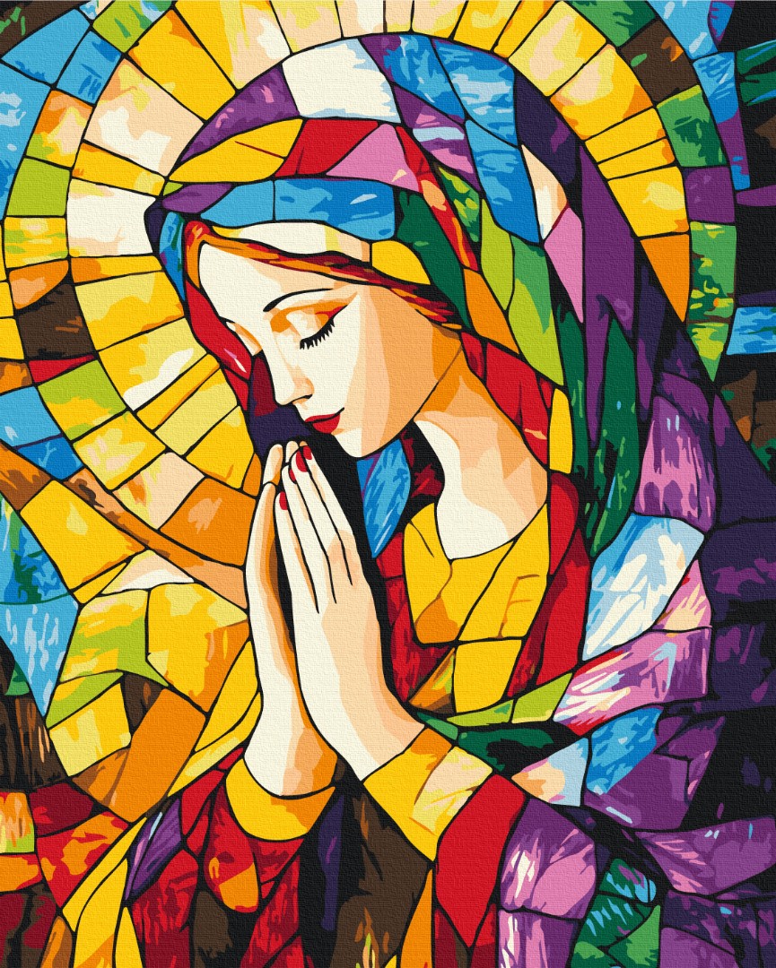 бполотно на лляній основі та дерев'яному підрамнику з нанесеною пронумерованою схемою майбутньої картини. Всі сегменти додатково пофарбовані в тон кольорів, якими буде зафарбовувати полотно