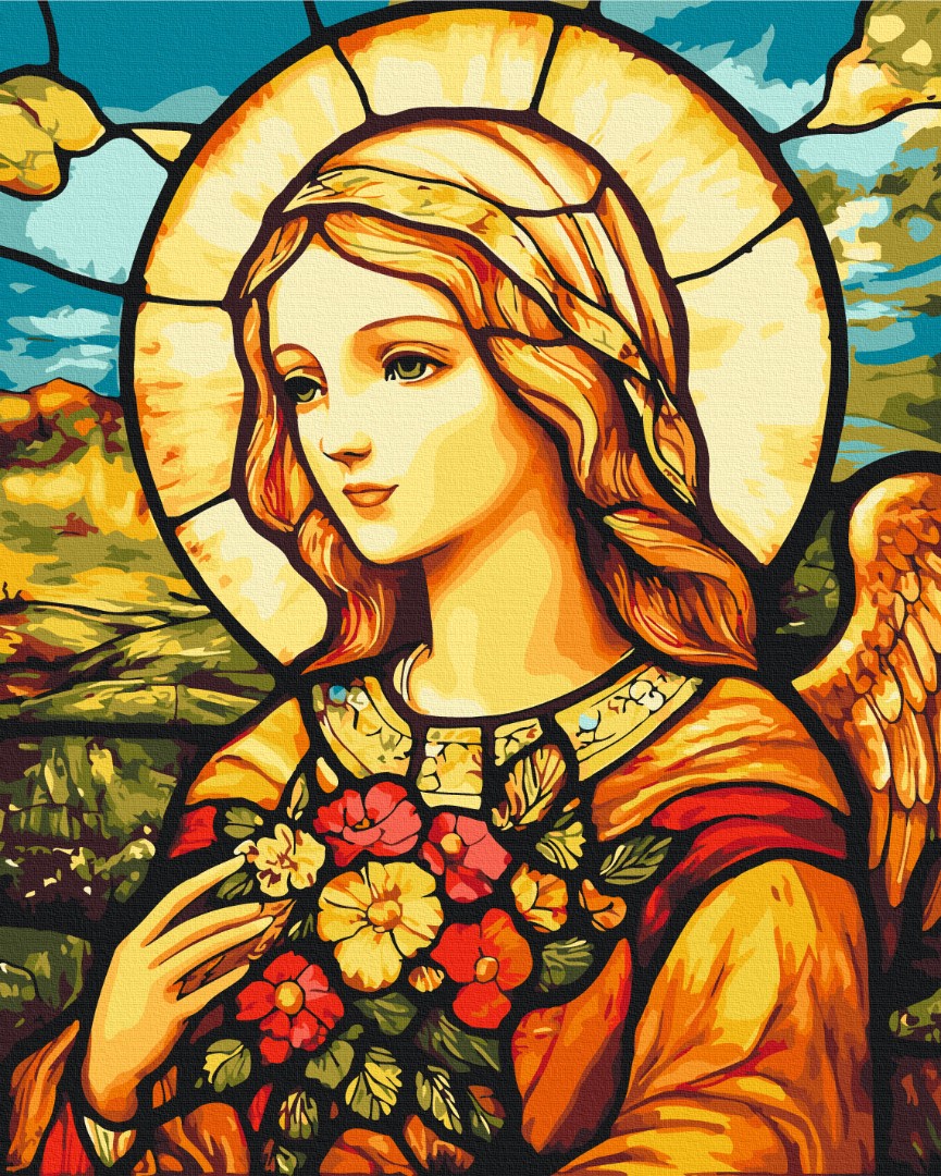 бполотно на лляній основі та дерев'яному підрамнику з нанесеною пронумерованою схемою майбутньої картини. Всі сегменти додатково пофарбовані в тон кольорів, якими буде зафарбовувати полотно